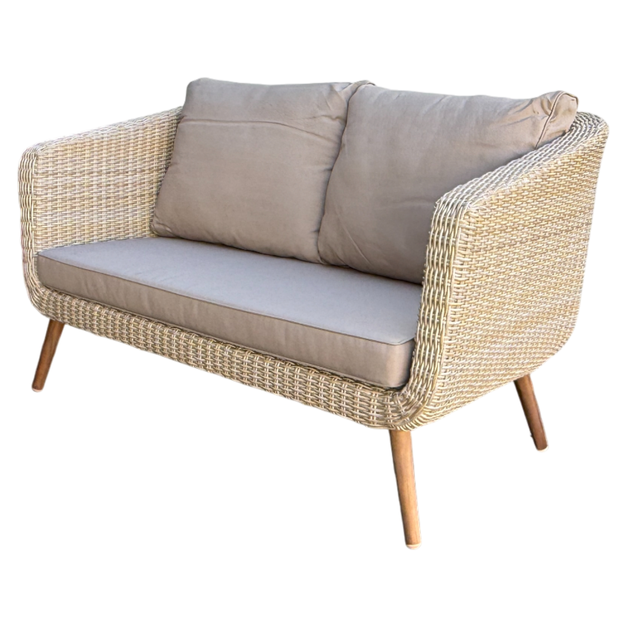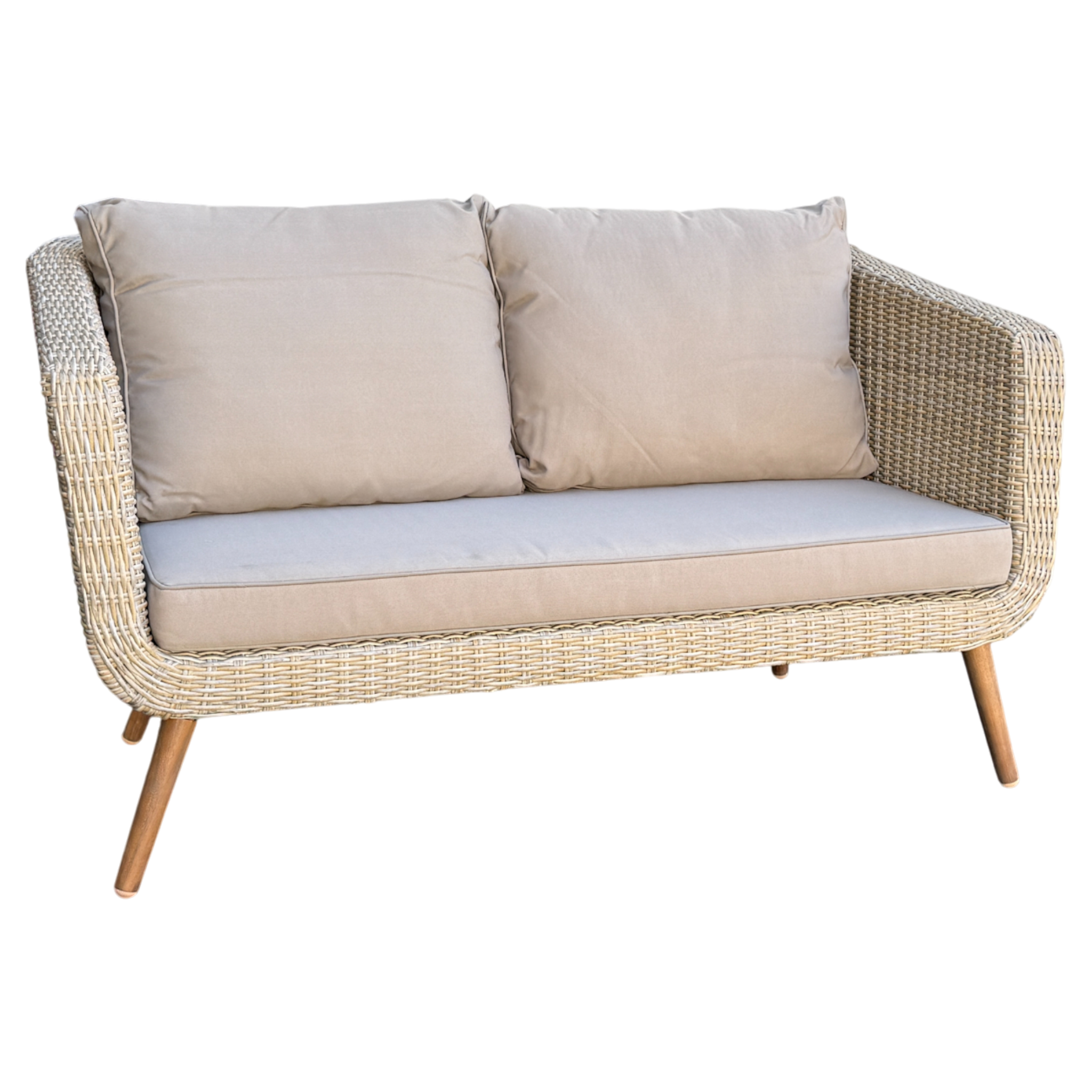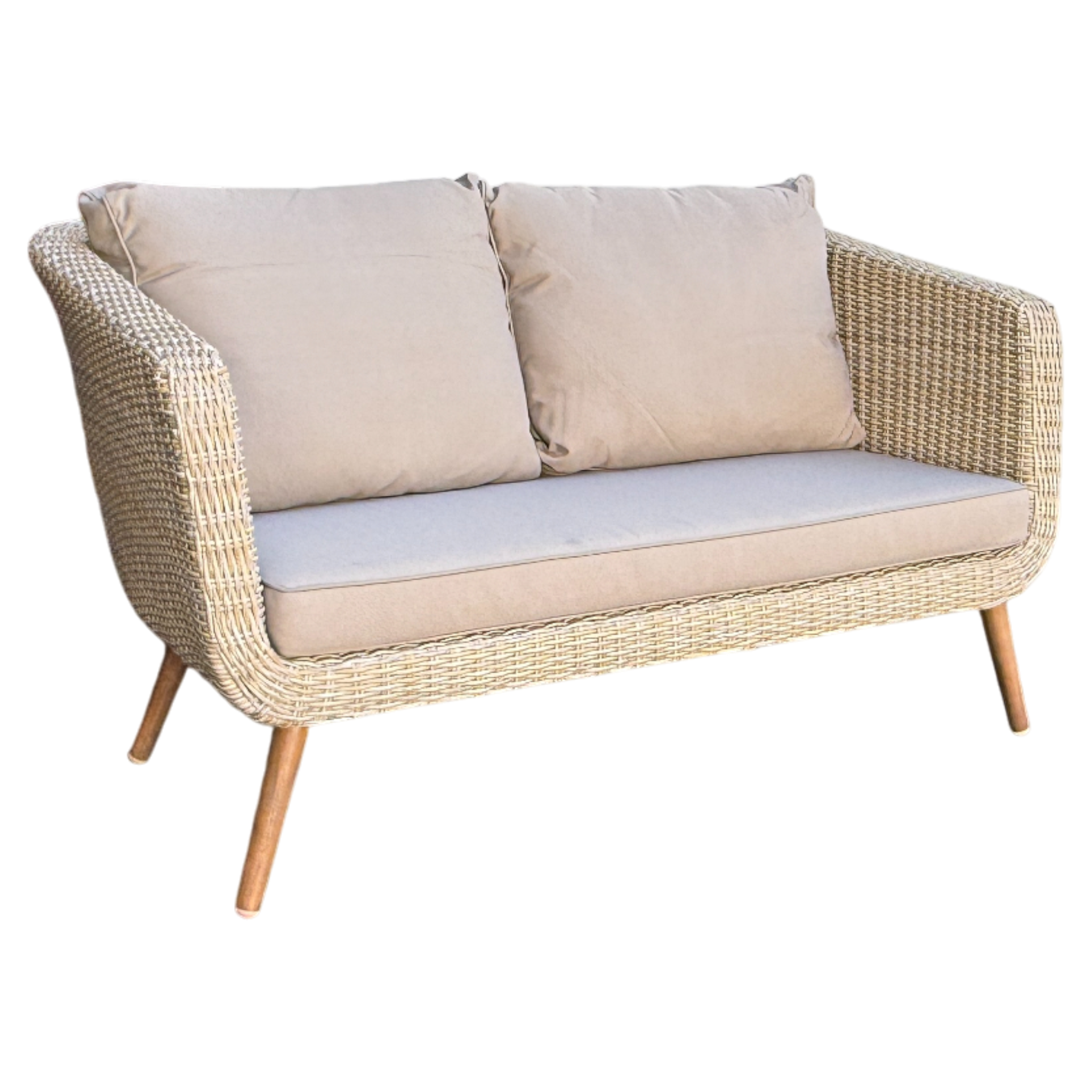 | Materials | Aluminium frame, acacia timber legs, synthetic half‑moon wicker, tempered glass, polyester fabric |