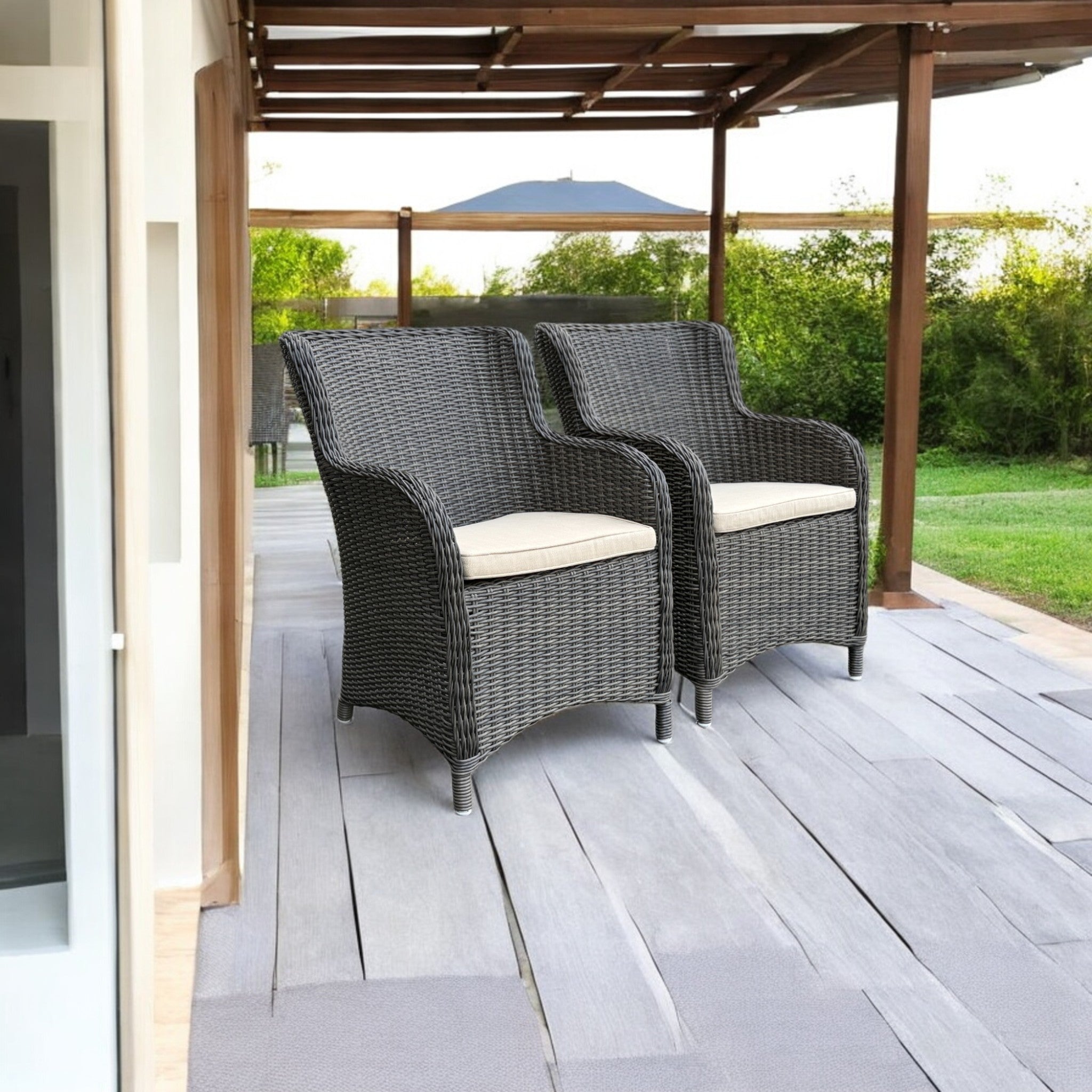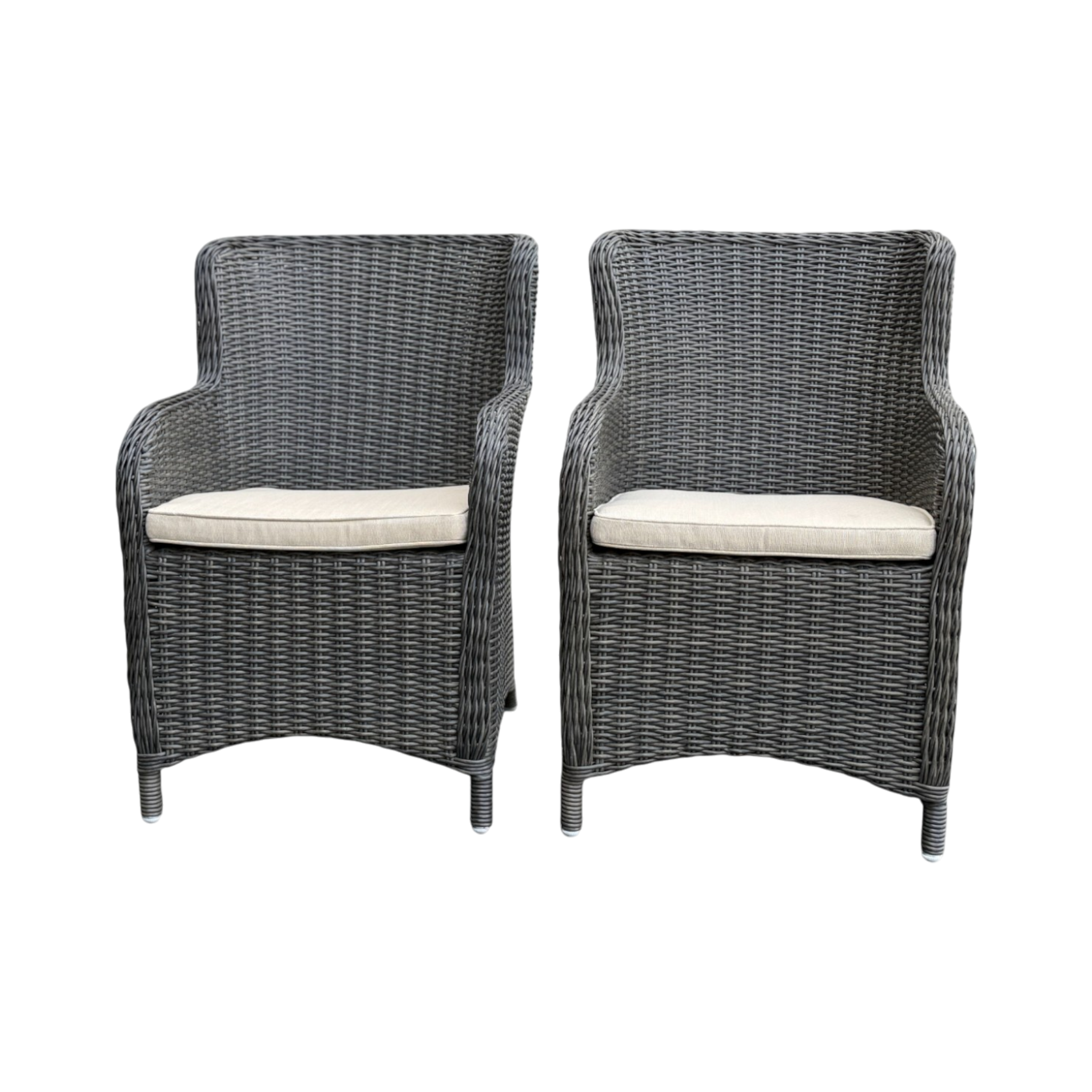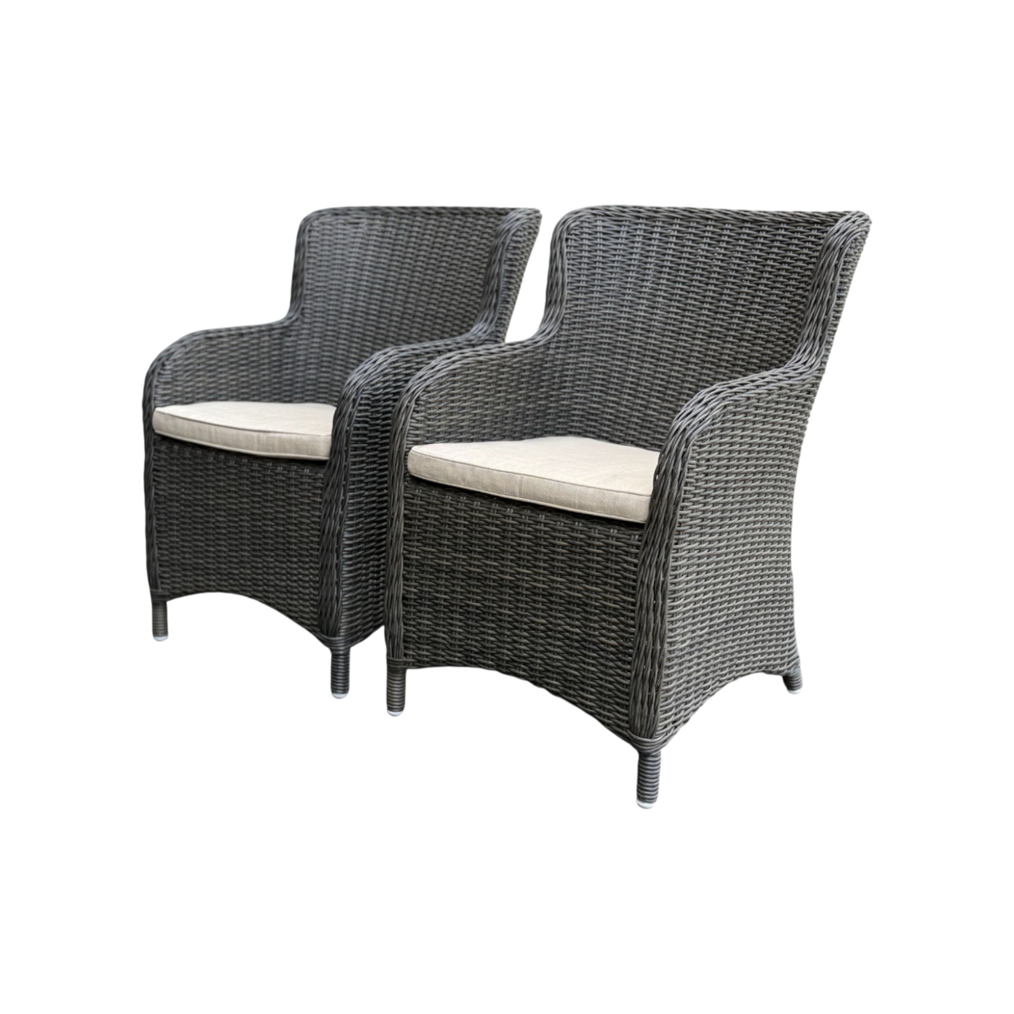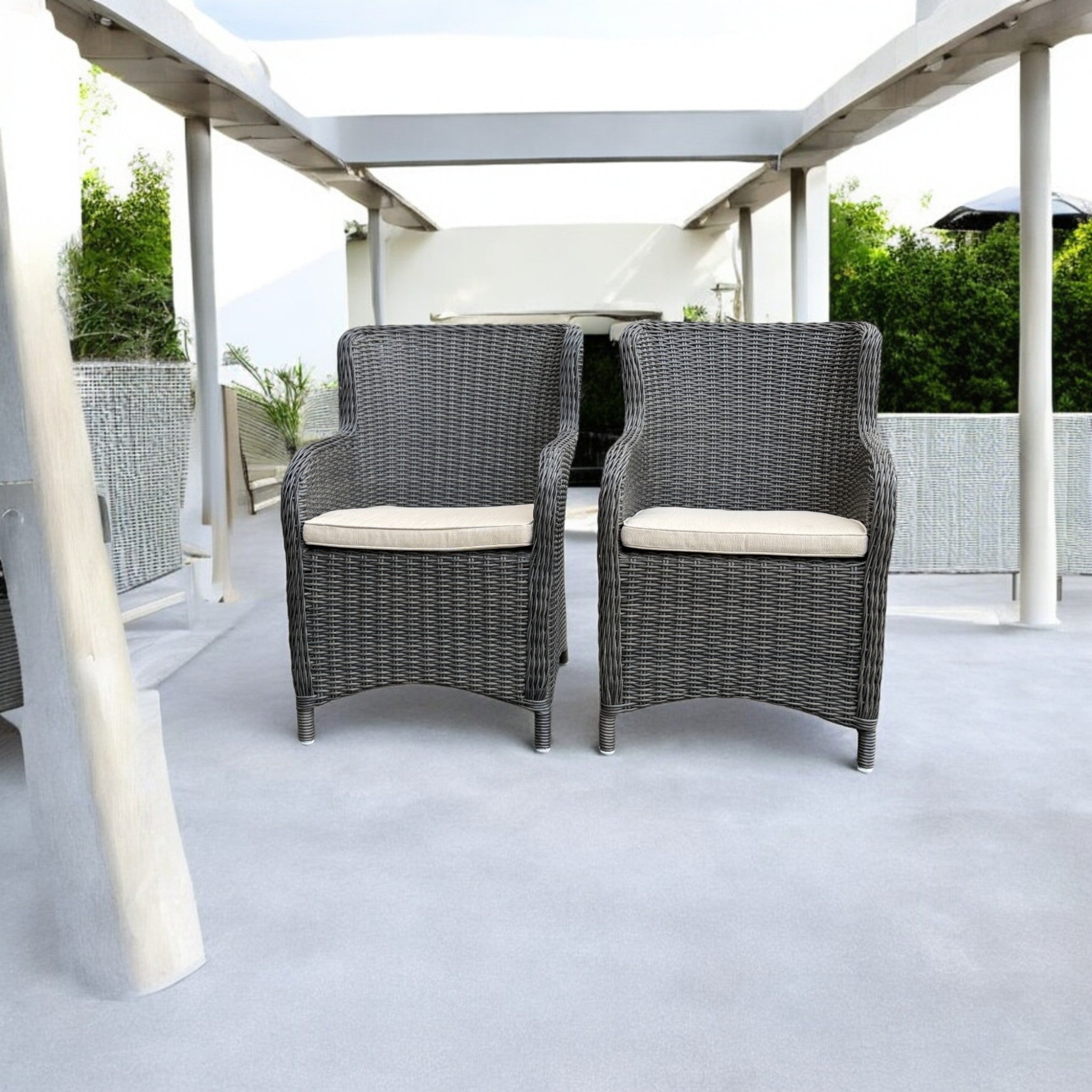 Our outdoor dining armchair features a contemporary style with sharp, angular lines, which will not impede your view if you're looking out over the setting. The chair has sidearms but no skirt, endowing it with a modern and light appearance that is ideally suited to modern contemporary homes and gardens. The wicker is woven around a quality powder-coated aluminium frame.